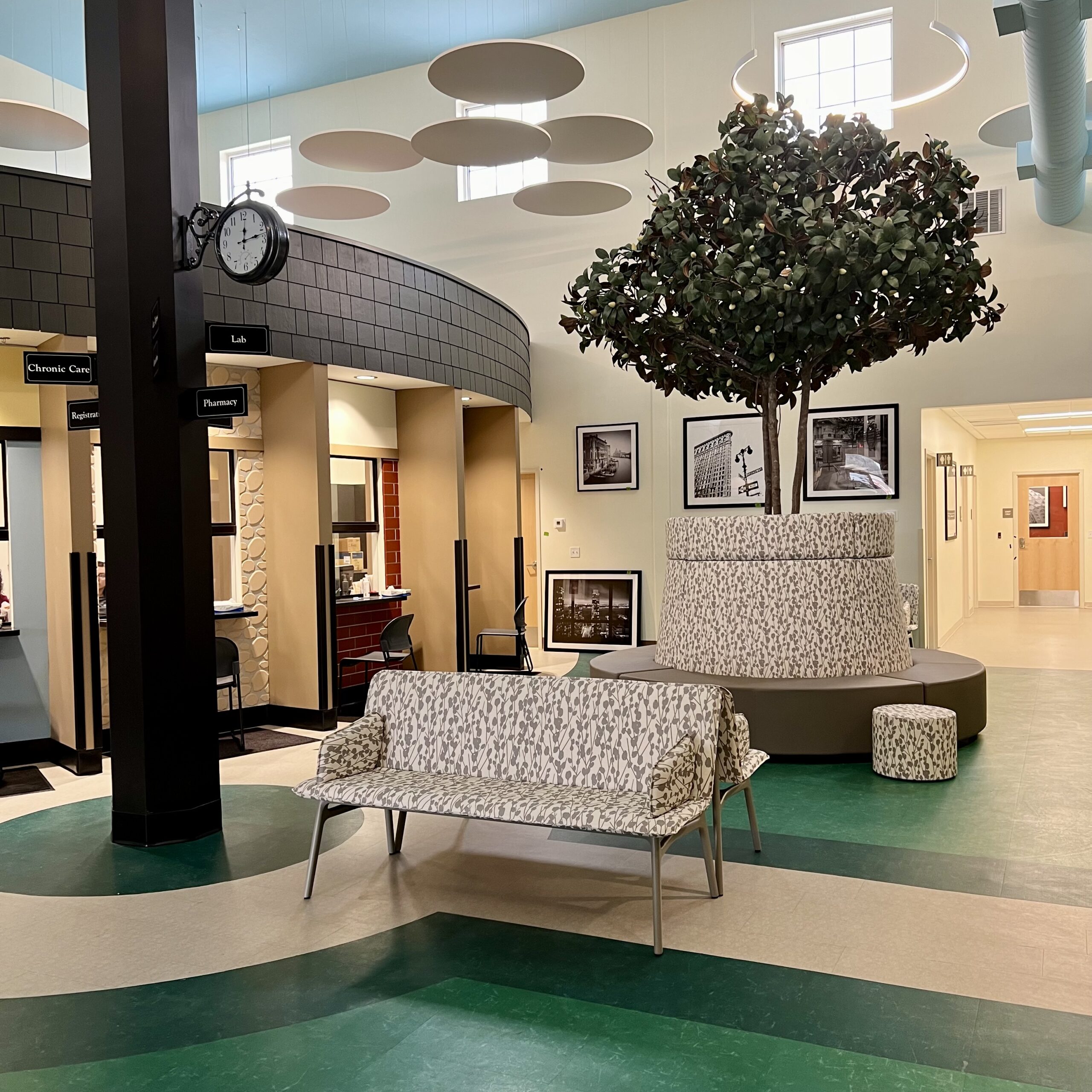 One of Community Care of West Virginia’s newest facilities is a multi-disciplinary clinic in Sutton, WV. The main lobby’s theme is a city park, and artwork throughout the spaces reflect world travel sites, to inspire this rural community to dream bigger.