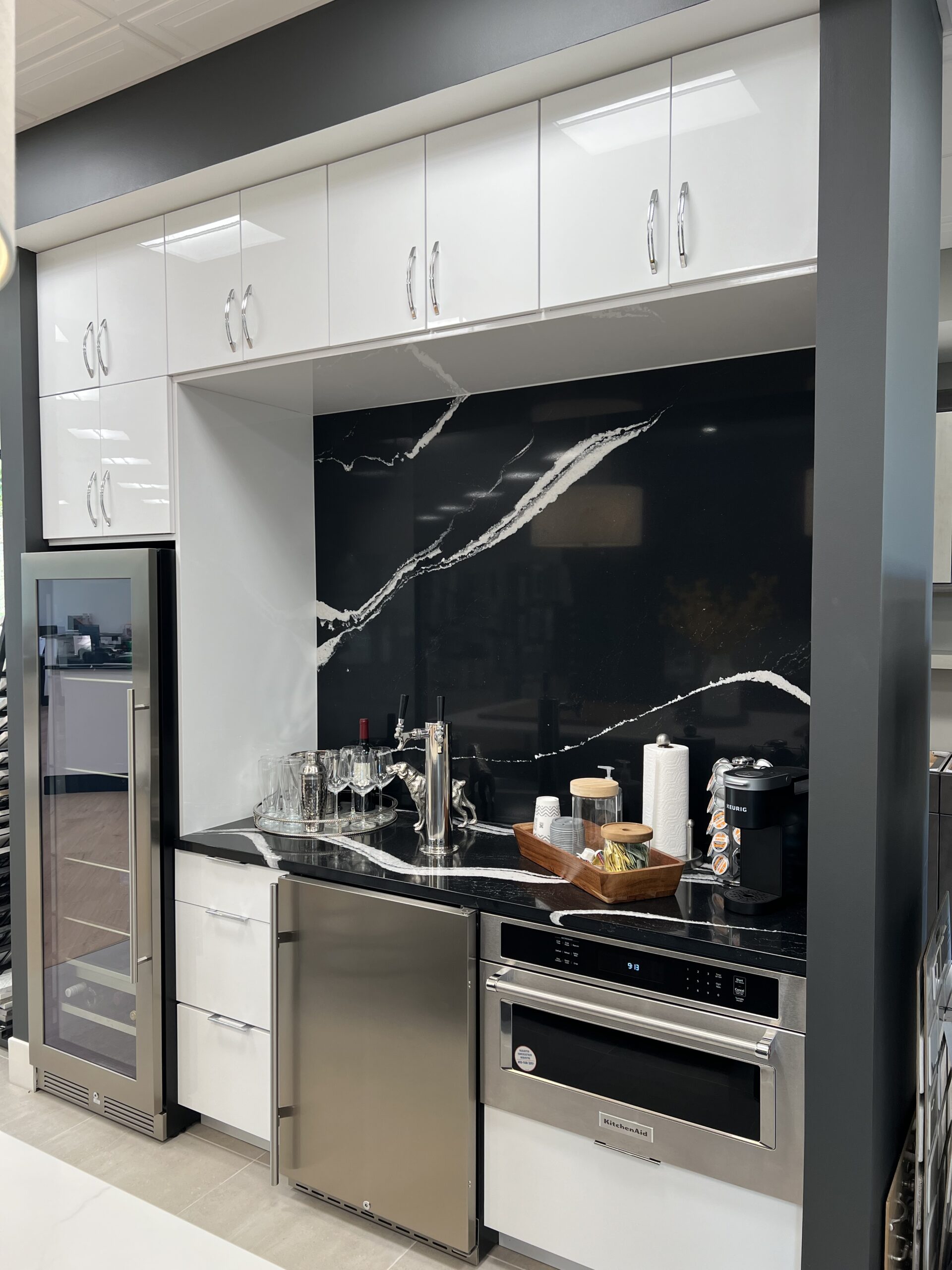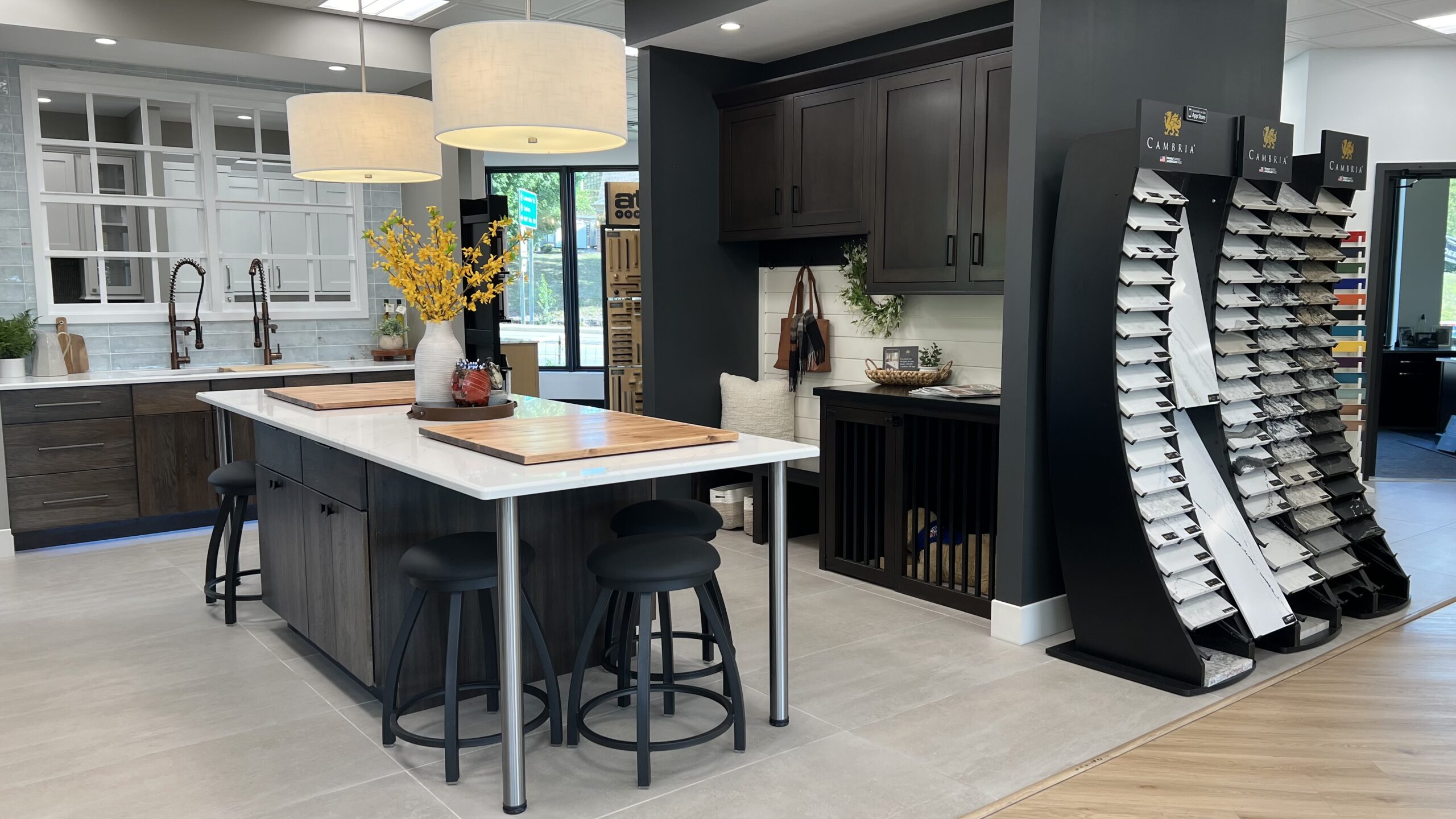 Vignettes are designed to showcase many different price ranges and styles so that customers are exposed to a wide variety of options for cabinets, countertops, finishes, and backsplash tile.