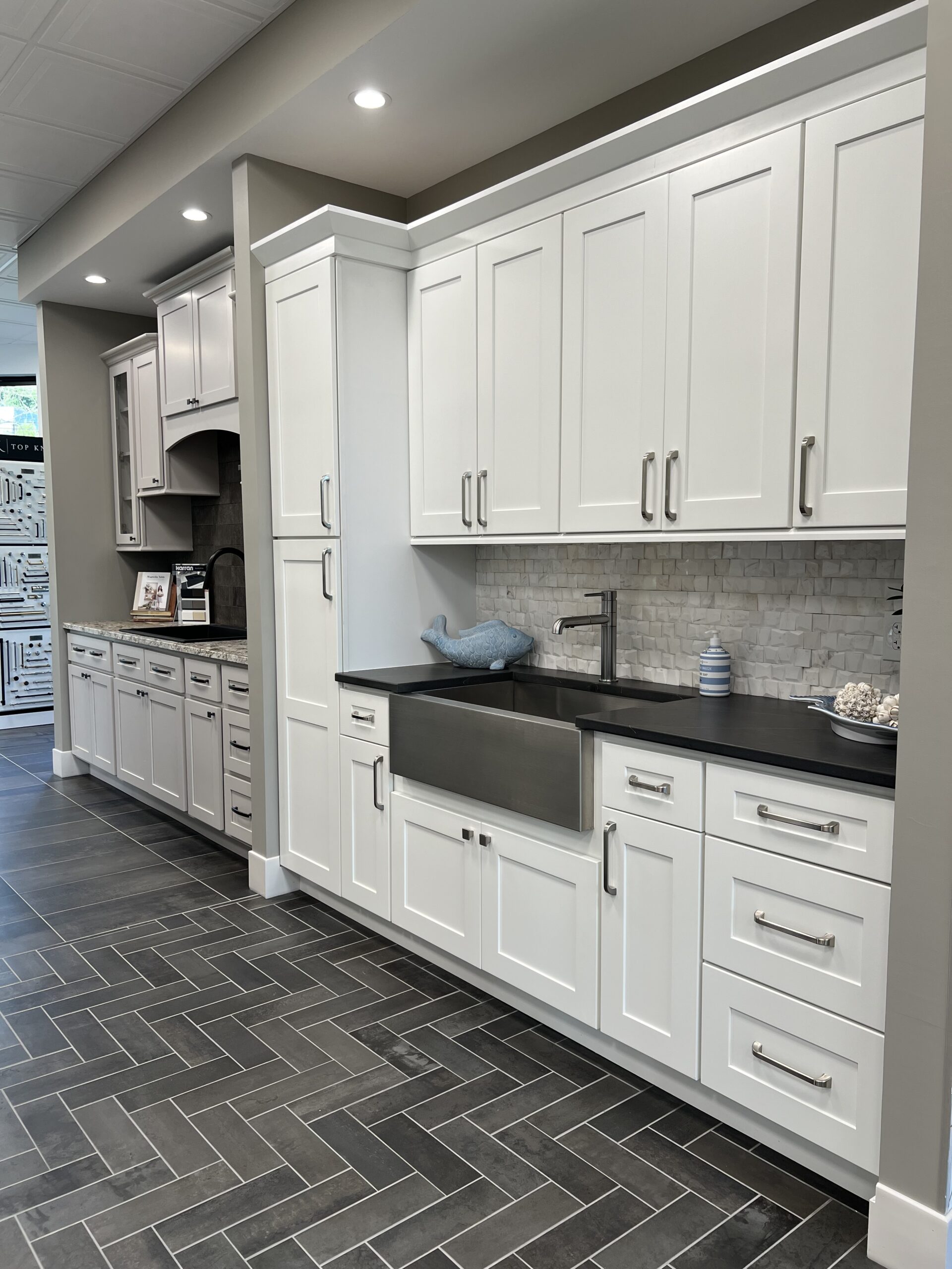 The first floor tile has a modern concrete look in 24”x48” size. The second tile has a darker, more mottled texture and is shown in two sizes, 12”x24” and a 4”x12” herringbone pattern. The third tiles are along the back and have a more busy marble pattern. These are shown in both matte and polished finishes so customers can see how that changes the look. The bath vignettes have two more different types of floor tile, also somewhat hidden from the main part of the showroom.